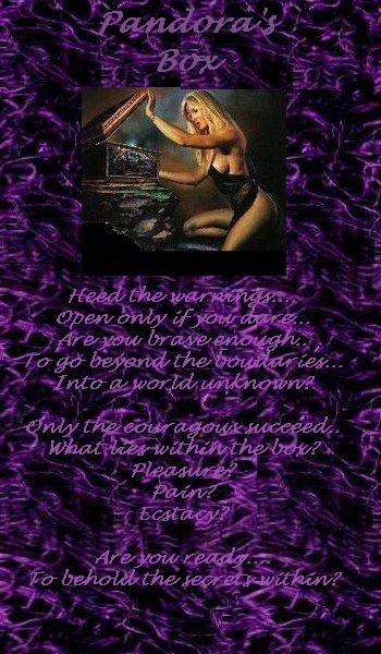 Thanks so much for visiting my page!! Please be sure to sign the guestbook on your way out so i know who's been traipsing around my little piece of cyber-space!! Pandora's Box is an ICQ chat room hosted by yours truly and my hubby, Palerider. Our number is 38154320. Why not stop by for a visit sometime? We promise not to bite...too hard!!